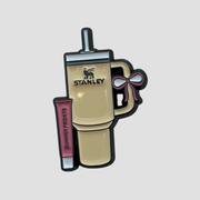 This design captures the ultimate "daily essentials" vibe, featuring a stylized Stanley Tumbler adorned with a cute bow, right next to a popular lip product. It’s the perfect accessory for anyone who loves high-low aesthetics, current trends, and cute hydration.